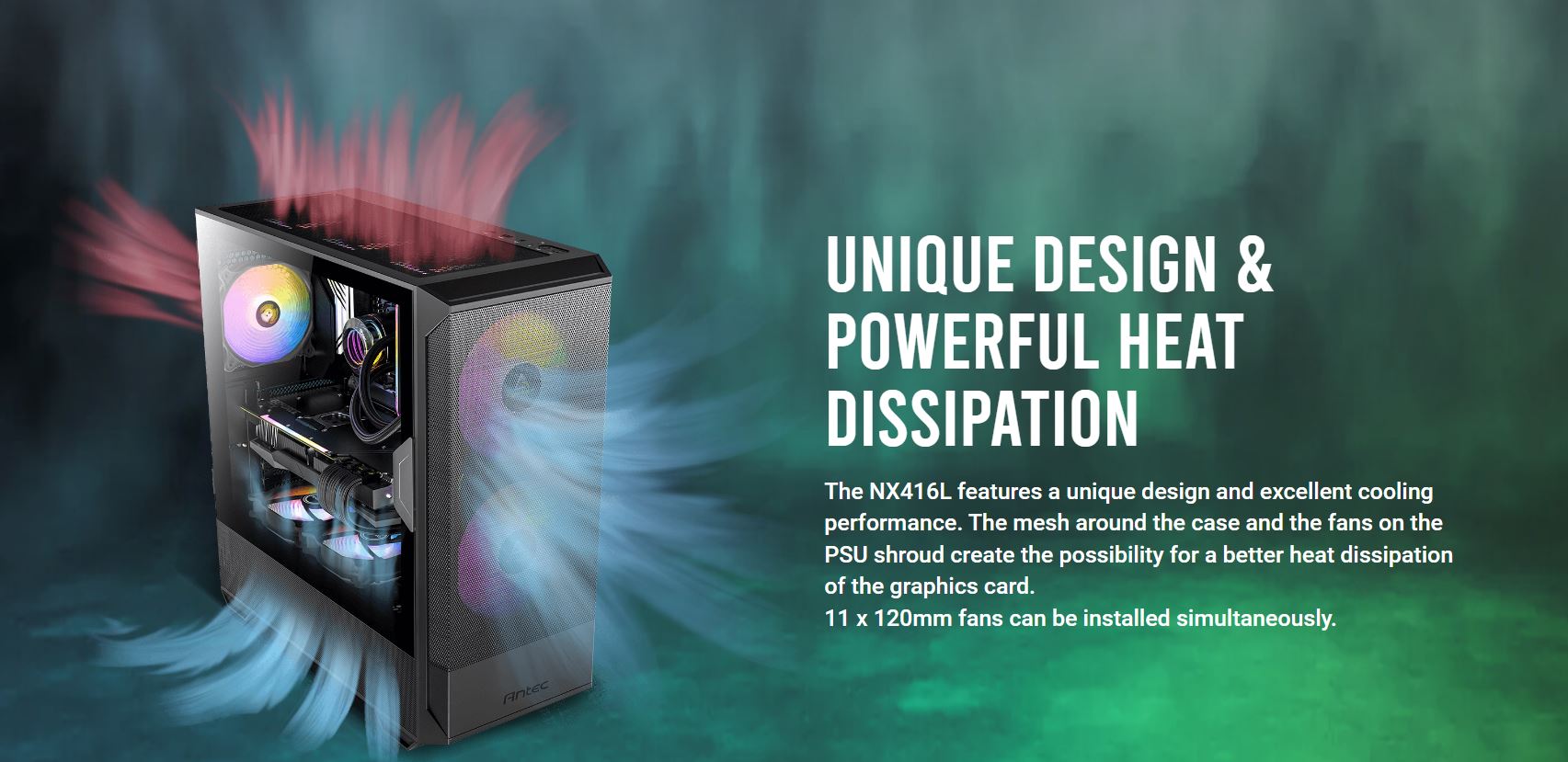 The NX416L features a unique design and excellent cooling performance. The mesh around the case and the fans on the PSU shroud create the possibility for a better heat dissipation of the graphics card.